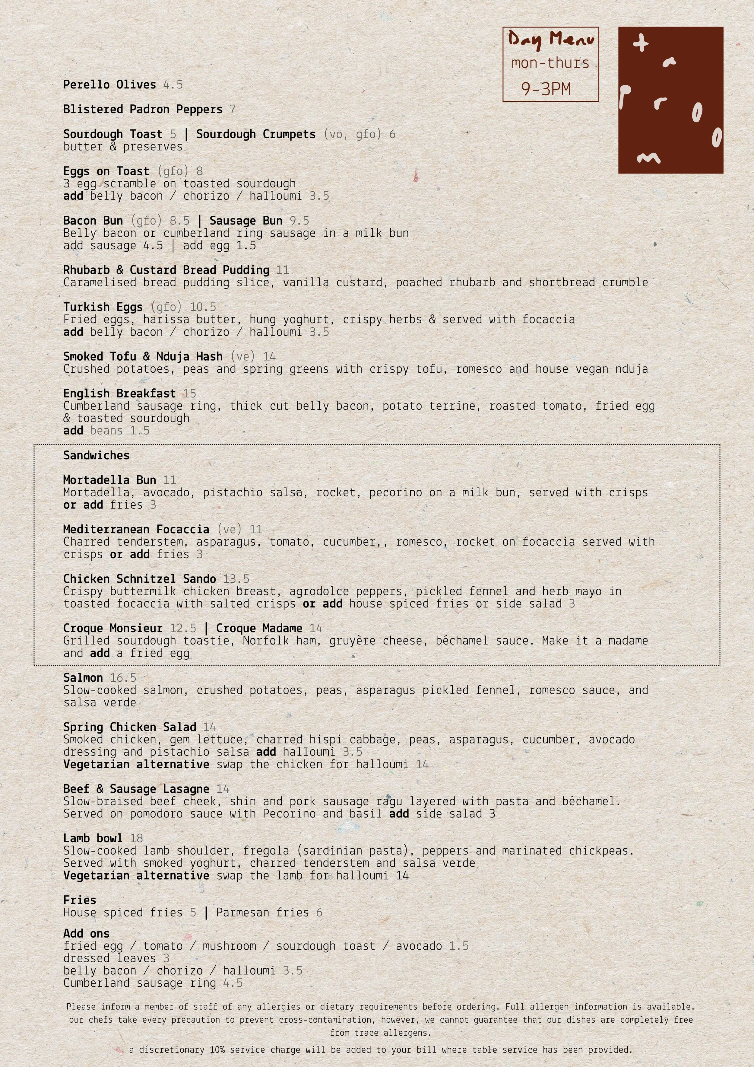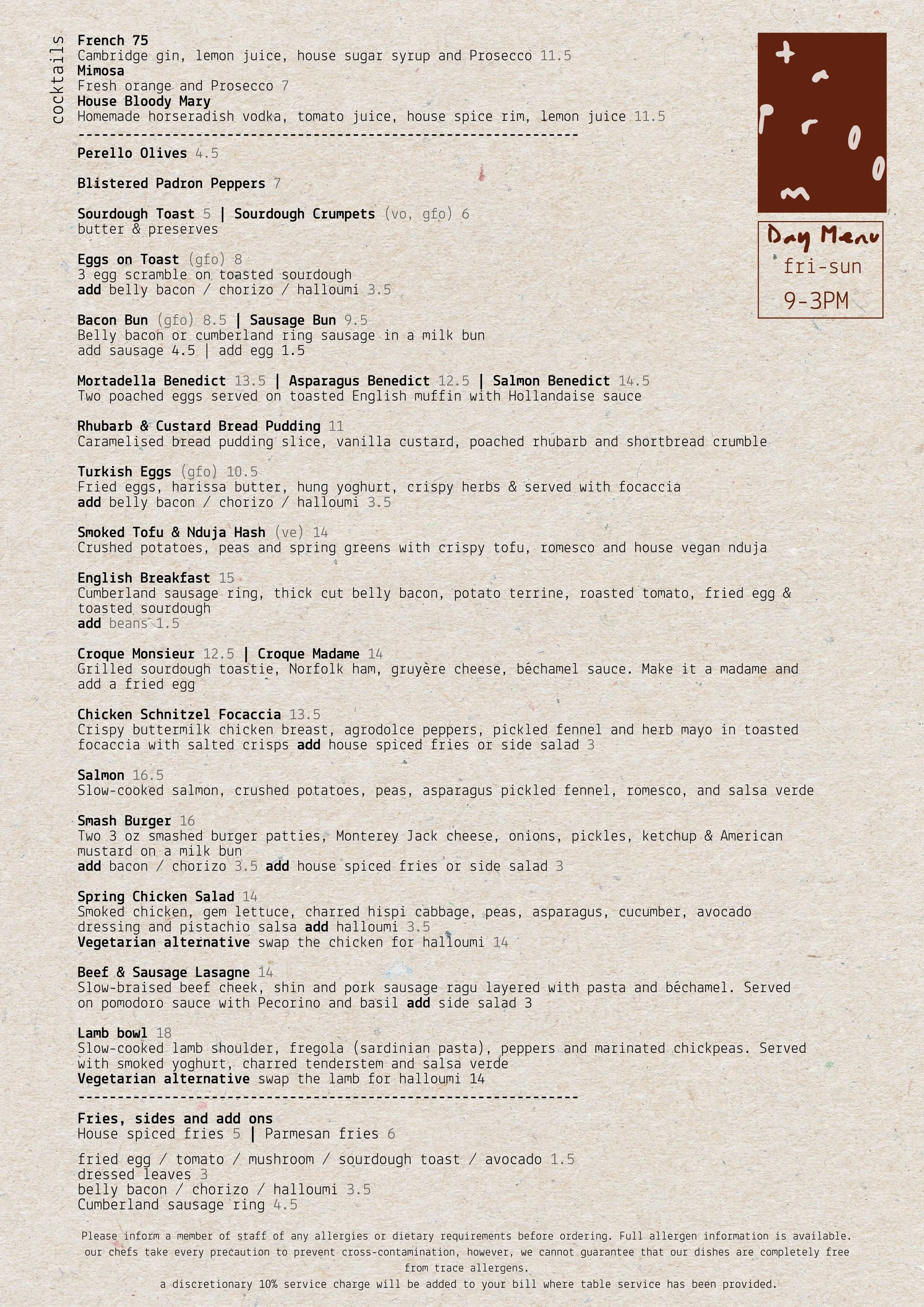 Mon - Thurs Menu Join us every day between 9am - 3pm for breakfast, brunch and lunch. BOOK HERE Fri - Sun Menu